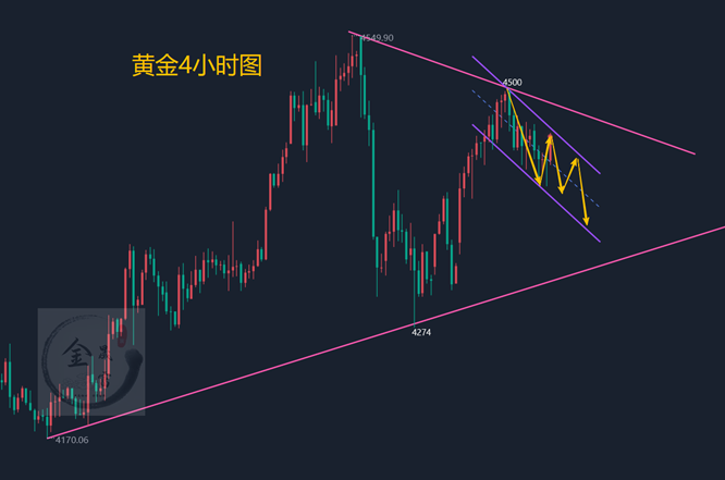 小时图上来看,均线已经交叉向下,早间分析中已经对此有解读,小时图结构重心下移,也会增加行情进一步调整的可能性,且日内黄金的表现也反映出当前多头不仅仅是无心上攻,更是有退场的打算,所以晚间黄金主线思路也依旧看调整回修。下方着重关注4400争夺,以及在周五非农前看行情回撤一次4380-75一带的可能。晚间上方也需将上方压力位下移,可将4465视为今晚的主压。综合来看,今日黄金短线操作思路上金晟富建议反弹做空为主,回调做多为辅,上方短期重点关注4465-4470一线阻力,下方短期重点关注4400-4380一线支撑,各位朋友一定要跟上节奏。要控制好仓位及止损问题、严格设止损,切勿抗单操作。具体点位以盘中实时为主,欢迎前来体验,交流实时行情,进群关注实时单。