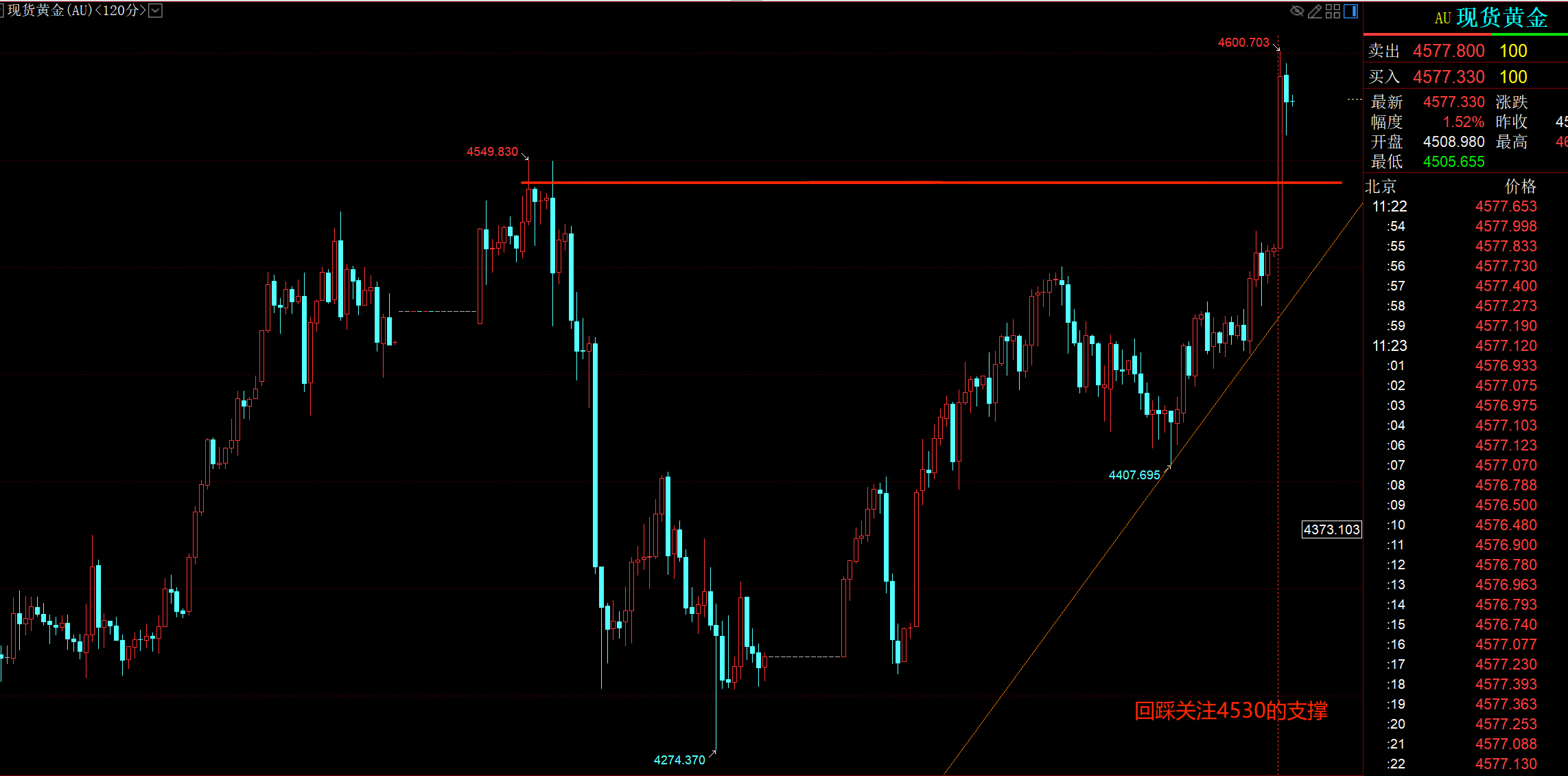 黄金前期跌至4300坚定提示大家做多,黄金如期跌至4275后,一路震荡上涨,到今天早盘,再次破位新高,最高涨到4600,短期和中期多头延续,不过需要等回踩再多,今天早盘黄金跳空高开,高走,突破4550的强压,亚欧盘关注4550的支撑,再就是实体4532的支撑,这两个位置没有跌破,黄金继续延续多头,跌破4532,黄金讲回补早盘跳空缺口,并且存在大幅调整风险,所以今天看多不要追多,高位关注4600的压制,亚欧盘震荡一直不破新高,可以高位做空。
