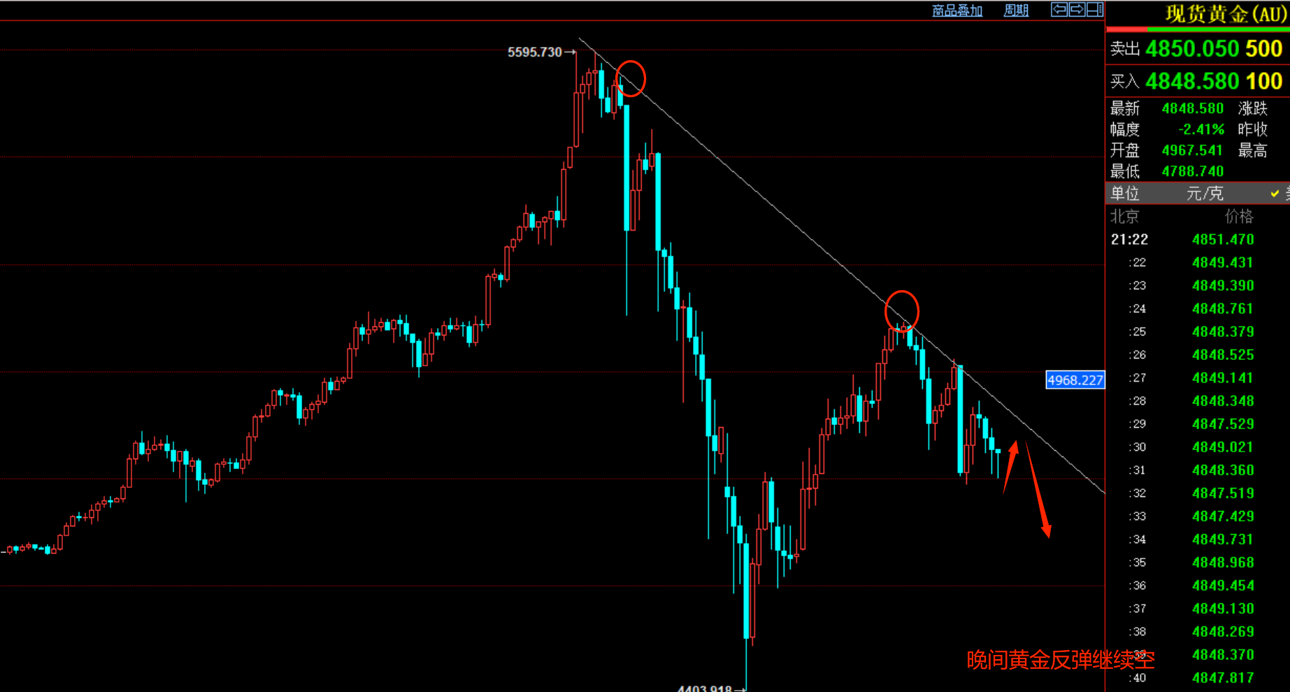 黄金周三多头延续,尾盘回落,今天早盘再次大跌,公开提示大家5020做空,如期大跌至4788,晚间反弹后可以继续做空,黄金短期处于震荡下跌的走势当中,如图,趋势线不破,黄金短期依然偏空头,继续看到4660.4800。