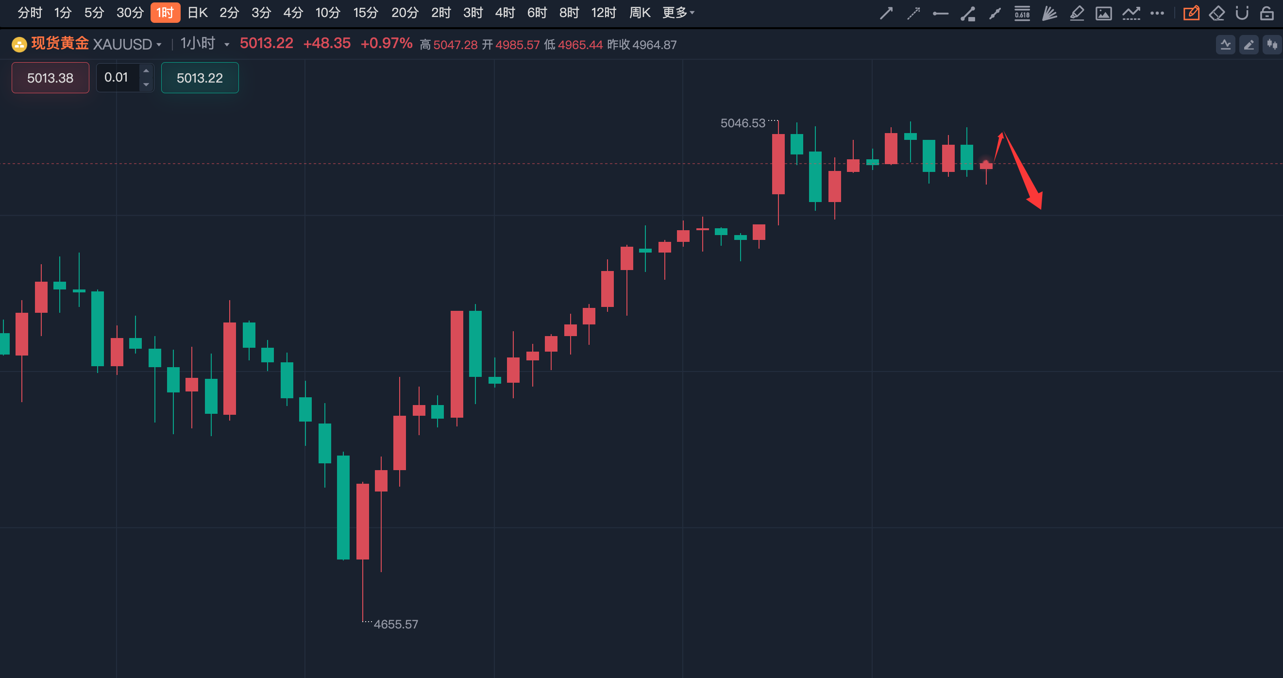 因政府停摆延迟发布的 1月非农数据 将在本周三(2月11日) 公布。这是判断美联储政策走向的关键,数据强弱将直接影响金价;市场正在密切关注美联储官员的任何讲话,以寻找关于首次降息时点的线索。目前市场普遍预期首次降息可能在6月;美伊核谈判等事件的进展,会阶段性地影响市场的避险情绪;今日黄金跳空高开最高涨至5046.53美元/盎司之后遇阻回落,1小时均线拐头向下,MACD死叉,黄金短期应该还有波下跌调整,上方关注今天高点的压力,晚间操作建议反弹空。