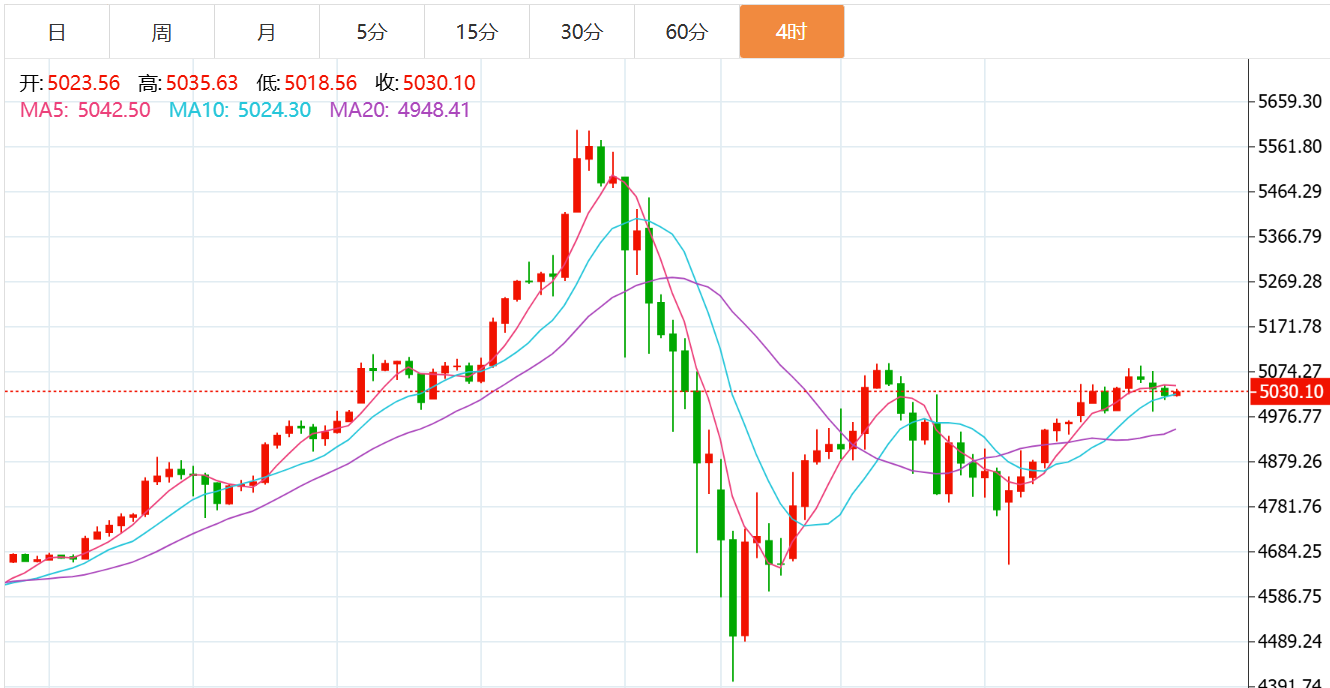 黄金技术面分析:黄金昨日高开后居高震荡,晚间行情再度出现一波回升,冲高至5086一线,日线收得一阳线,站上10日线上方。日线结构上来看,昨日黄金再度上涨收阳,主要是三方面因素推动的:一是上周五收阳回升的惯性延续;二是基本面依旧带来一定的避险买盘情绪;三是美元的走跌调整也加码黄金的回弹动能。虽然黄金昨日再收阳,且站上10日线之上,但是阳线幅度并不是很大,且昨日盘中也表现出上涨乏力的状态,所以对于目前黄金的强势还是要谨慎看待,日线结构上依旧视作为此前的超跌反弹趋势,只是短线震荡空间被放大,但尚且不能改变中期调整趋势。日内黄金还是先关注上周反弹高点5090-5100一带强压,下方则着重关注3条均线带支撑5010、4960、4920附近争夺。综合来看,黄金今日短线操作思路上贺博生建议以回踩低多为主,反弹高空为辅,上方短期重点关注5090-5140一线阻力,下方短期重点关注4980-4930一线支撑。