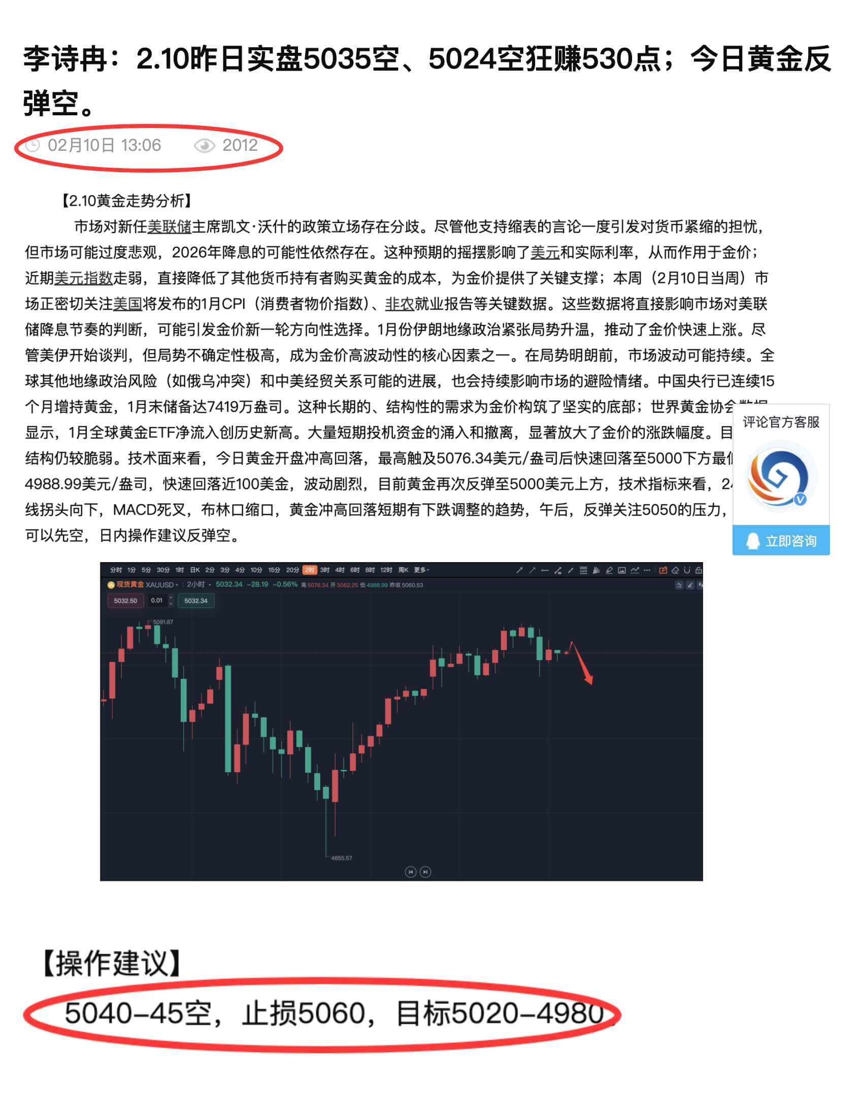 汇通网2月10日讯—— 李诗冉:2.10今日全网公开5045空精准布局,实盘5045空、5053空大赚330点;晚间黄金回踩多。