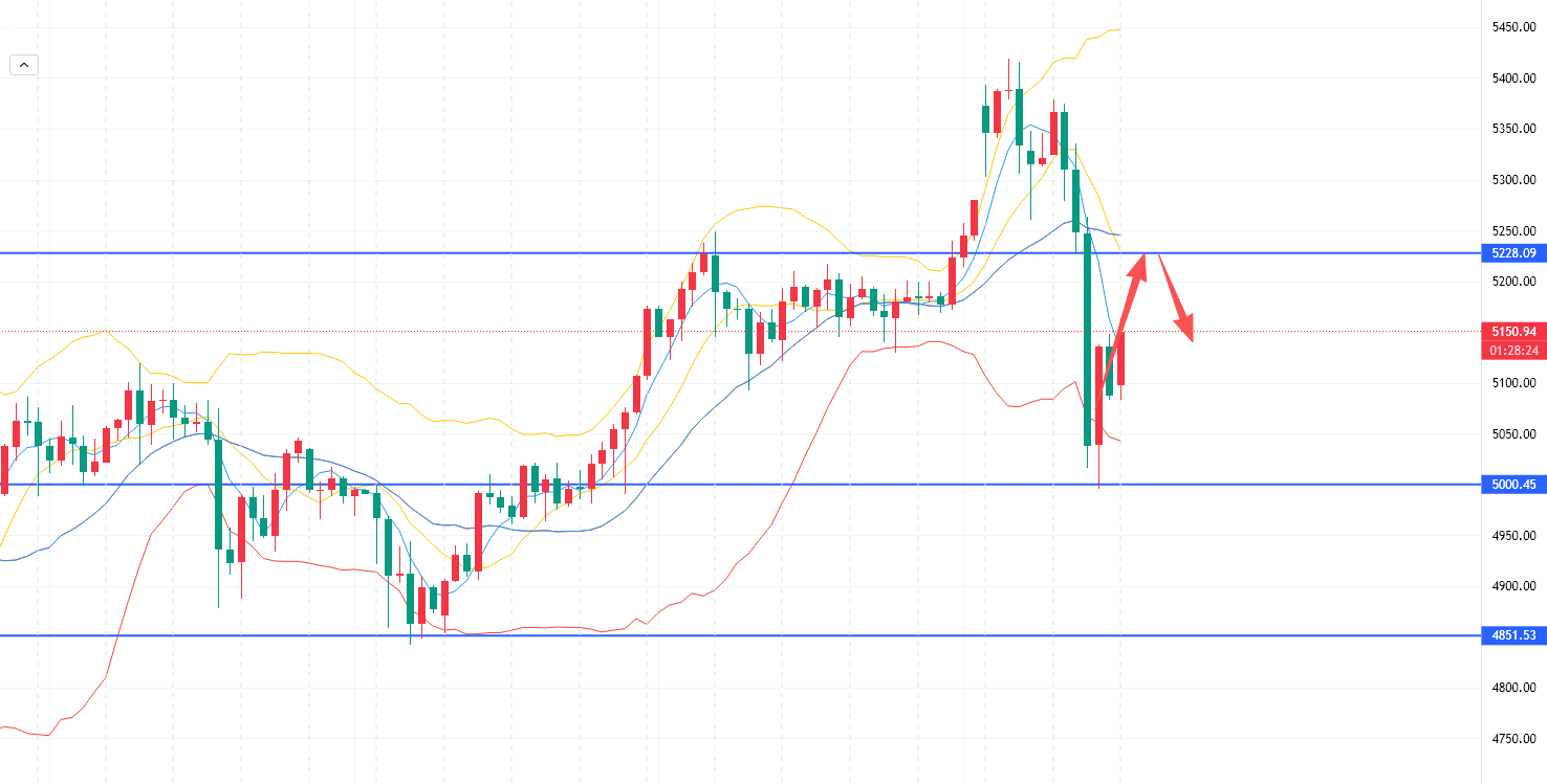 昨日跌破5000关口,日线收阴,日内先高空低多为主。上方阻力短期关注5220-5230小区间,接近轻仓试空。强势突破看向下方支撑5000整数关口,这里支撑还是比较强劲的,接近多。极限回撤见到4900、4850强支撑都是多。短期高抛低吸为主,多头暂时回避,洗盘结束后中期依旧看涨不变。