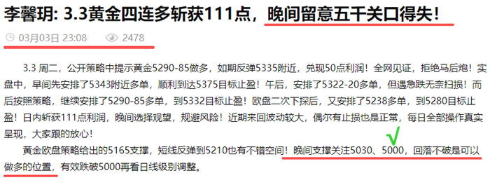汇通网3月4日讯—— 李馨玥:3.4黄金5000完美拉升,日内主多辅空震荡对待!
