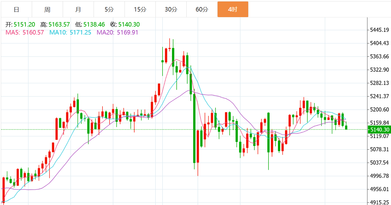 结合黄金一小时图,隔夜黄金震荡回到小时图均线带之下,自此也将短线行情打回偏弱原形。今日早间行情出现一波下调后又回弹,测压至均线带5170附近便再受阻,所以日内若无突发的基本面利好,那么黄金在技术上是很难再重返均线带上方的,故日内可关注小时图均线带压力5170-90,主要压力则关注区间上沿5220-30一带,日内下方空间相对较大,先看早间低点5120附近争夺,此位也是20日线支撑,一旦此位失守则将大大提升下调的概率,下方可再去关注5050-20一带支撑测试。综合来看,黄金今日短线操作思路上贺博生建议以反弹高空为主,回踩低多为辅,上方短期重点关注5190-5240一线阻力,下方短期重点关注5100-5050一线支撑。