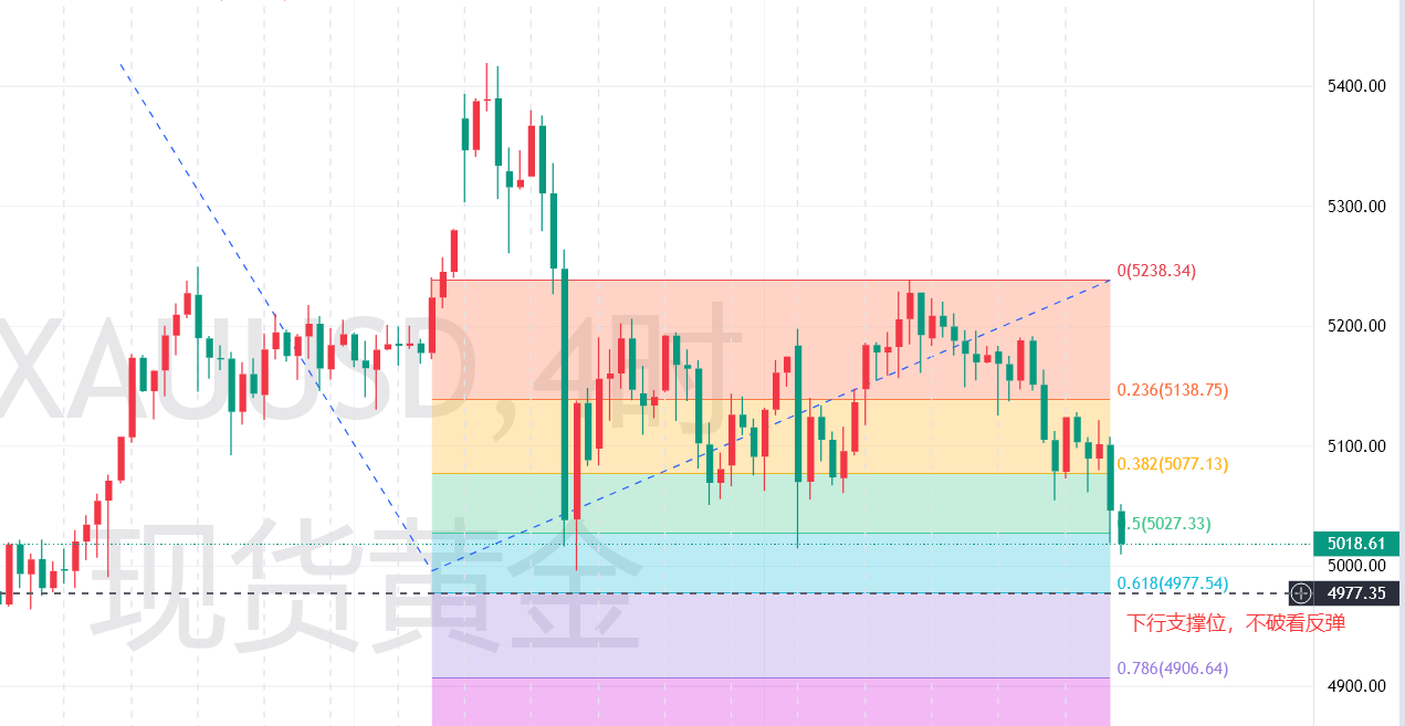 技术面解析:周一开盘前,我的核心思路是建议延续上周的下行趋势,继续看金价震荡走跌。但昨日实际盘面走势并未完全符合预期,欧美盘时段金价两次尝试向下发力,却都未能有效跌破早盘下探的低点,最终全天整体围绕5000美元关口展开震荡整理,多空双方暂时处于胶着状态,没有一方能够占据明显优势。
