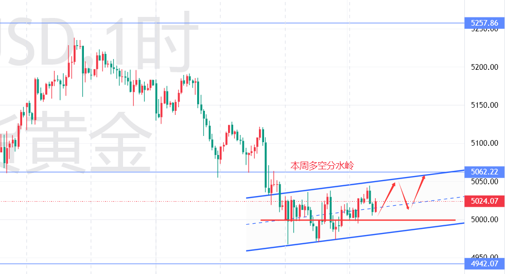 从小级别盘面(小时线)来看,本周已经走过的行情态势呈现出明显的规律:低点逐步抬升,高点在创下短期新高后随即回落,目前已经初步形成一个平行上行的通道雏形。对于这种明确的形态,我们无需过度纠结方向,按照通道形态顺势操作即可。当前金价处于5000美元关口之上,欧美盘时段需重点关注此位置的支撑有效性——若能守住5000关口,金价有望继续向上方阻力发起冲击;若跌破此关口,则可能再次回归震荡下行。上方阻力方面,重点关注5050美元和5062美元两个关键位置,其中5062美元作为多空分水岭,一旦有效突破,或将打破当前震荡格局,开启新一轮上行走势。