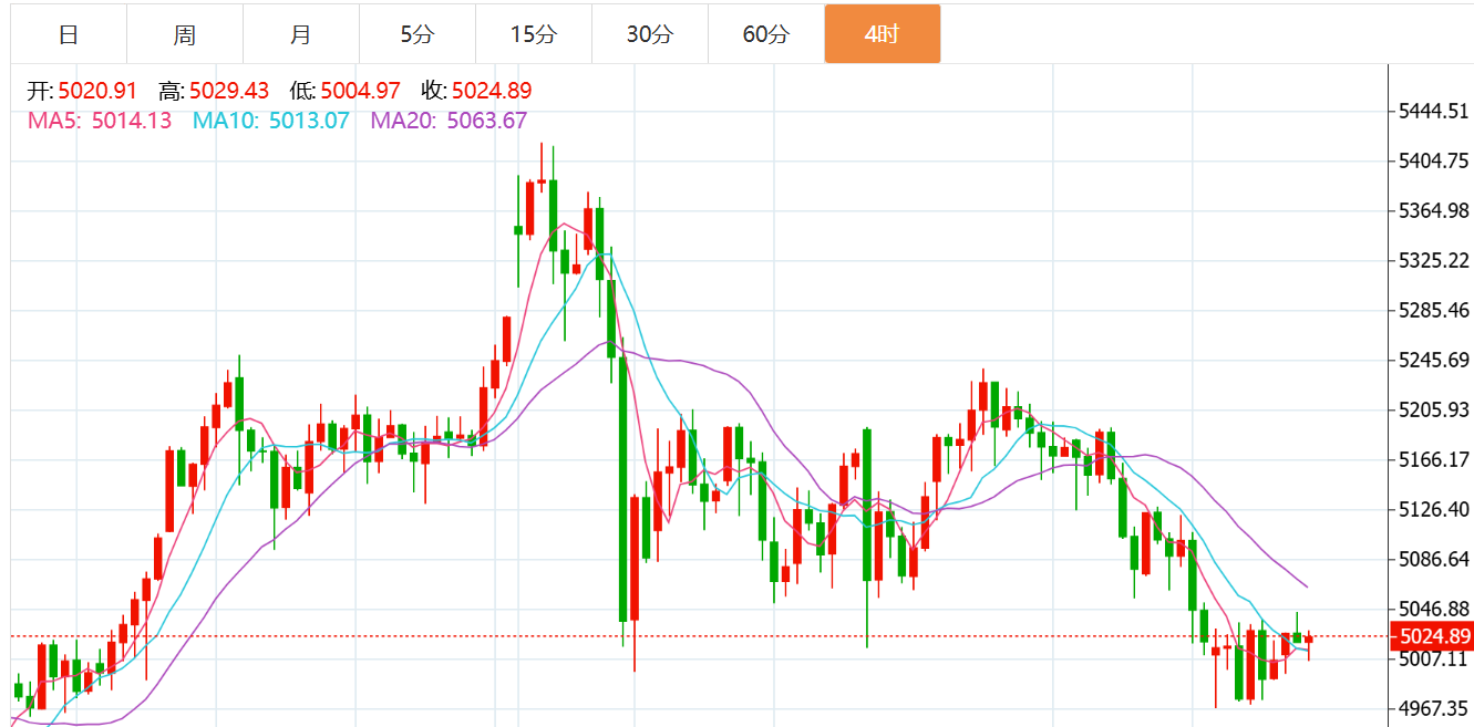 结合黄金一小时图,今日黄金暂看震荡继续,相对还是偏弱的,上方可继续关注5日线5060附近压力,主压带则看10、20日线5110-30,但日内测试测压5日线的可能性很小。日内下方则继续关注5000关口争夺,昨日围绕此关口防范拉扯,虽今日回到其上,但依然不是很稳,依然有再破的可能性,如果今日再回5000之下,那么下方依旧看4970-50、4920-00预期。综合来看,黄金今日短线操作思路上贺博生建议以反弹高空为主,回踩低多为辅,上方短期重点关注5065-5090一线阻力,下方短期重点关注4970-4945一线支撑。