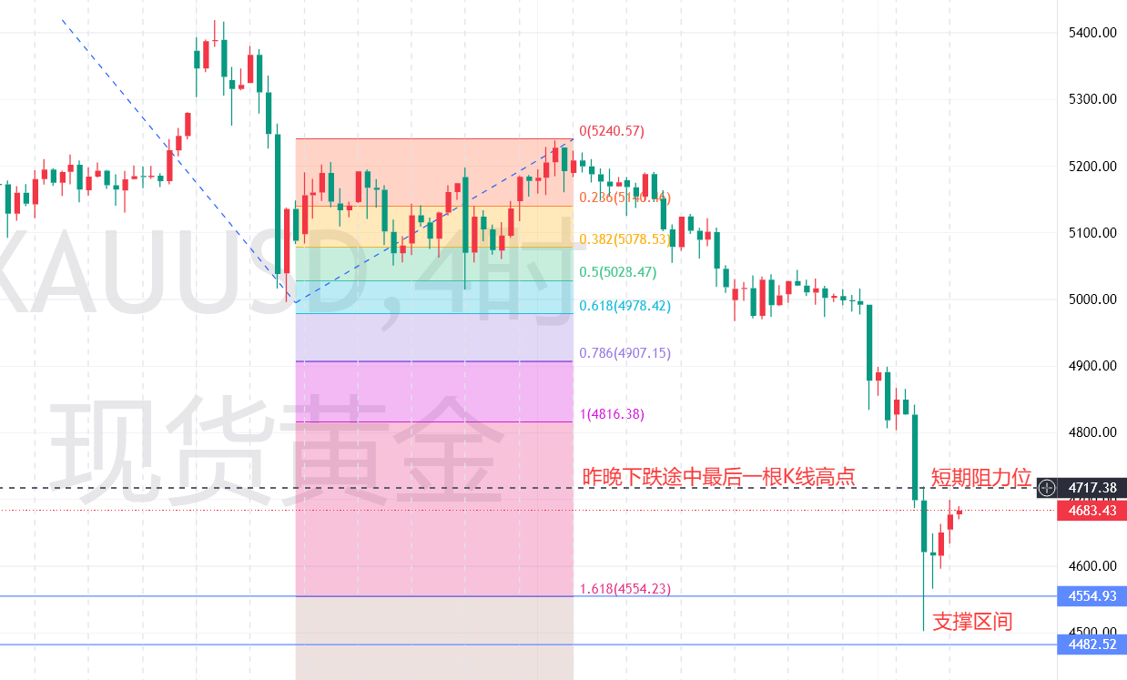 4小时级别:暴跌之后,金价进入低位震荡修复阶段,走势呈现“反弹高点逐步下移”的特征,很明显,空头趋势没有改变,震荡只是为了后续进一步下行蓄力。短期震荡区间锁定在4638-4700美元,这个区间内多空博弈相对平缓,但整体还是空头主导,若能突破4700美元,短期可能会反弹至4750美元附近;但只要跌破4638美元,就会直接下探4600美元关口,甚至进一步延伸。