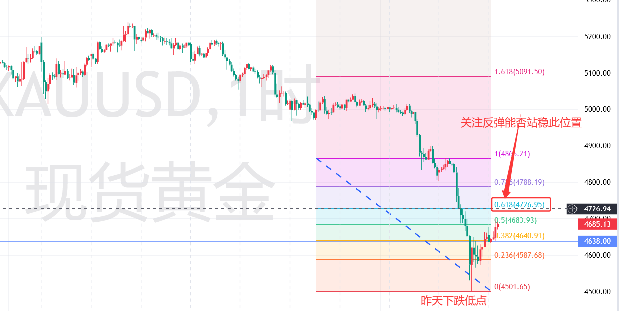 小时级别:早盘虽然有小幅反弹,但量能明显不足,反弹缺乏持续性,属于典型的弱势修复。短线支撑关注4650-4660美元区间,若回落至这个区间,可能会有短暂企稳;短线阻力则是4700-4720美元,反弹至这个区间附近,大概率会遭遇空头压制,很难继续上行。综合来看,明确今日的操作思路,核心原则只有一个:顺应空头趋势,谨慎参与反弹,坚决不盲目抄底,不追多,严控仓位和止损,这也是我一直强调的操作底线。