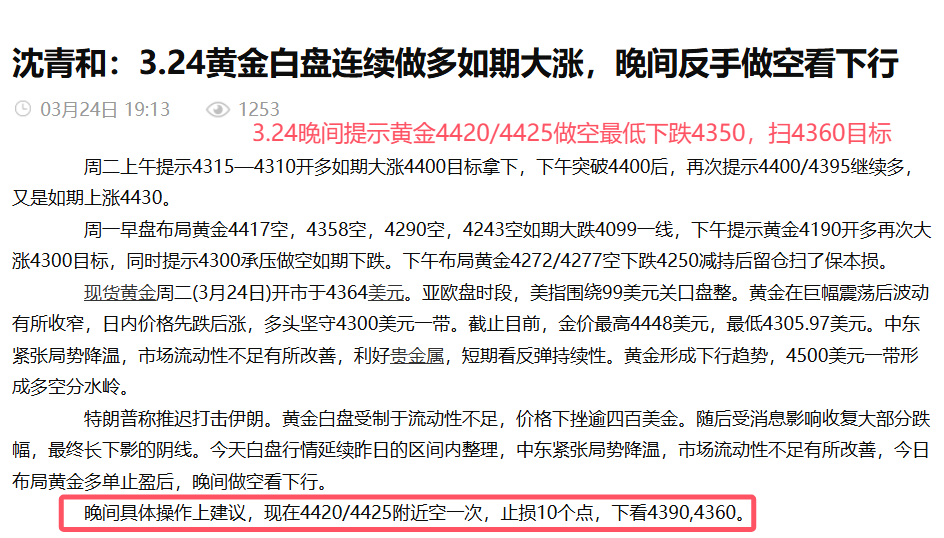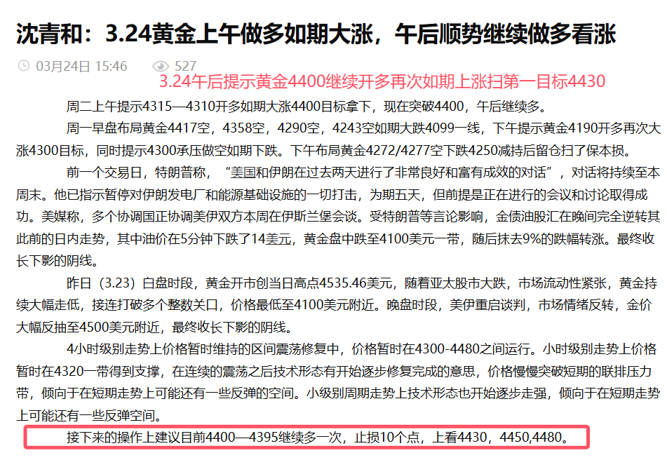 周二上午提示4315—4310开多如期大涨4400目标拿下,下午突破4400后,再次提示4400/4395继续多,又是如期上涨4430,晚间提示4425/4430做空又是如期下跌4360目标拿下。策略均是全网公开,欢迎翻阅查验。