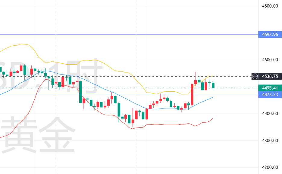 结合本周收盘态势,预计下周现货黄金仍将维持宽幅震荡格局,整体呈现“震荡偏强、多空博弈加剧”的走势,具体操作建议:短线方面,建议是回调4471附近参与多单看涨,保护4460小时级布林带中轨,目标上看4516附近;若行情先涨至4516附近可着手布局空单看跌,保护4527这里,目标下看4473即可。中长线方面可等待金价下跌到4424附近参与多单看上行,保护4400关口,目标看金价能否上触4600位置(国内金亦可参考此思路)