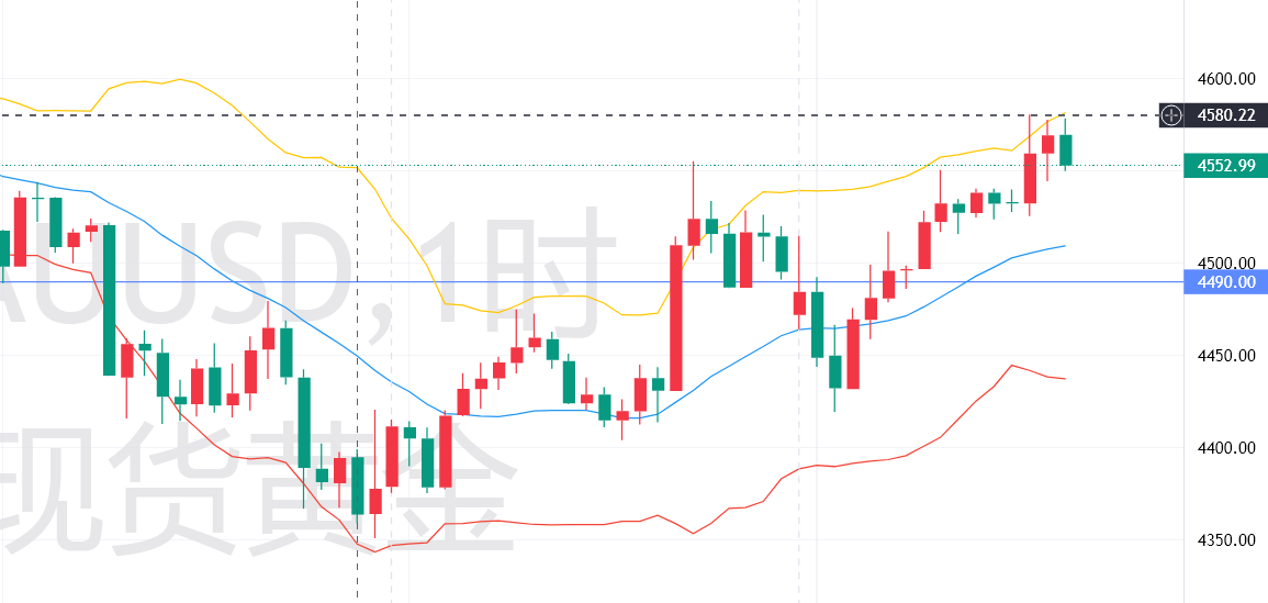 四小时级别,短期反弹动能强劲,中期空头趋势持续缓解,当前处于技术性修复加速阶段,价格沿短期均线上行,走势相对强势,但冲高后承压迹象明显。RSI指标自超卖区持续回升,目前已接近70超买阈值,显示多头动能强劲但需警惕回调风险,尚未进入极端超买区间,仍有一定上行空间;MACD绿柱完全收敛,已形成金叉,红柱持续扩张,显示空头动能彻底衰减,技术性修复需求得到释放,多头动能逐步占据主导;短期5日、10日、20日均线形成多头排列,明确短期多头趋势,打破此前相互缠绕的僵持态势,均线系统对价格形成有效支撑;布林带向上开口,价格运行在布林带中上轨之间,多头趋势明显,上轨压制作用逐步显现,今日冲高至4580.09美元后受上轨压制出现回调,抛压逐步增加。