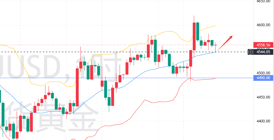 四小时级别,短期反弹动能强劲,中期空头趋势持续缓解,当前处于技术性修复加速阶段,RSI指标自超卖区持续回升,目前已接近70超买阈值,显示多头动能强劲但需警惕回调风险,尚未进入极端超买区间,仍有一定上行空间;MACD绿柱完全收敛,已形成金叉,红柱持续扩张,显示空头动能彻底衰减,技术性修复需求得到释放,多头动能逐步占据主导。短期5日、10日、20日均线形成多头排列,明确短期多头趋势,打破此前相互缠绕的僵持态势,均线系统对价格形成有效支撑;布林带向上开口,价格运行在布林带中上轨之间,多头趋势明显,上轨压制作用逐步弱化,今日价格一度冲高至4618.86美元,随后小幅回落至4552.25美元附近,抛压有所增加,下方重点关注黄金分割位及布林带中轨形成的支撑区间,同时结合最新行情,关注4624美元100日均线关键位置的突破情况,以及纽约金走势对伦敦金的联动影响。