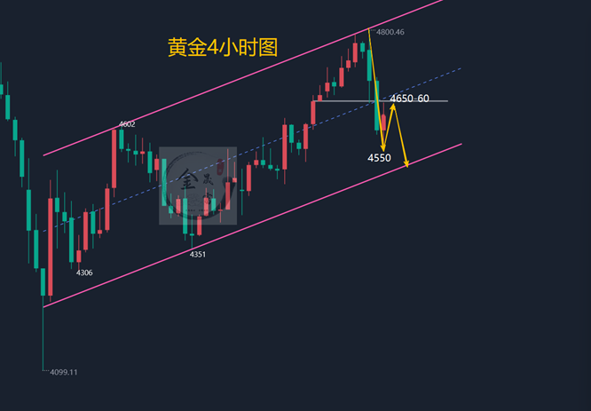 技术面来看,日线级别多头形态彻底破位,5/10日均线形成死叉,价格跌破4700、4680双重关键支撑,布林带向下开口,MACD绿柱急剧扩张,空头趋势确立。4小时图连阴下跌,RSI跌至30下方超卖区,但KDJ未现明显拐头,跌势未止。4小时中期的变化也非常明显,大阴吞阳,均线被打压下来,形成勾头表现,布林收口,一切信号都是走弱的表现,那么,今天确定强弱转换,下方可以逐步看到4500-4480,大家要注意节奏变化。总体来说,本周前三天的上涨走完,现在需要转换思路,看后两天的调整空间,周四,周五黄金高空逐步看下行空间。综合来看,今日黄金短线操作思路上金晟富建议反弹做空为主,回调做多为辅,上方短期重点关注4650-4680阻力,下方短期重点关注4500-4480一线支撑,各位朋友一定要跟上节奏。要控制好仓位及止损问题、严格设止损,切勿抗单操作。具体点位以盘中实时为主,欢迎前来体验,交流实时行情,进群关注实时单。