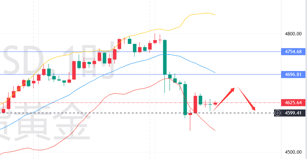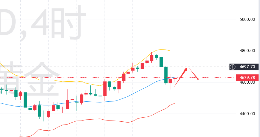 四小时级别来看,金价前期突破4600关键关口后形成的上行趋势彻底被打破,均线系统呈现明显空头排列,5日均线向下穿越10日均线、20日均线,形成双重死叉,5日均线4660附近形成短期强阻力,10日均线4、20日均线支撑均已失守,预示中期震荡走弱格局正式形成。KDJ指标高位形成死叉后持续下行,已进入超卖区间,但尚未出现拐头迹象,预示短期回调需求仍未释放完毕;布林带开口大幅扩张,价格持续向下方运行,重点关注4550附近支撑有效性,企稳则可能维持4550-4650区间震荡整理,跌破则进一步向4500-4450区间下探,技术面走势进一步走坏。
