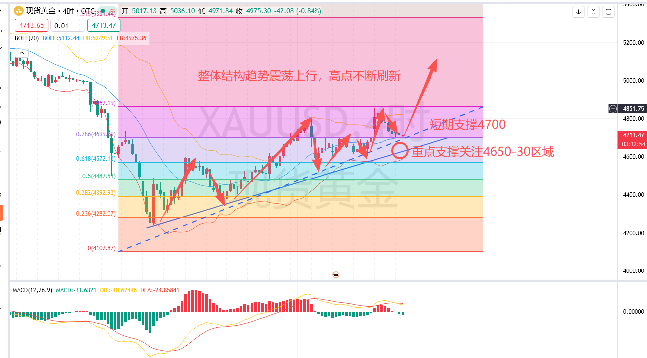地缘政治久久不能平息,黄金大涨后再次衰落,技术层面来看,短期来看空头释放的差不多了,1小时MACD即将再次形成金叉,配合点位上来看4700仍是短期关键分水岭,下破有望再次触及4650-30区域,4小时仍保持良好的宽幅震荡上行节奏,回踩就找准时机多头上车,切勿追涨杀跌,哪怕是价格昨日触及4840后一路震荡下行,在这个过程中做多反复短线套利也是非常快速的,多头都会形成快速的反扑,每次触及短期云层支撑都会有不错的反弹,这个大家都清楚的;总而言之,日内不追涨杀跌,保持回踩多思路继续进行,现在价格下来了反而对于做多更安全且健康,布局方面4710-15区域多,下破4700损,精确给个4698附近;继续持续走弱在4650-30区域出现整理企稳再次上车做多即可,目标4800破位看4850-4900了结即可,中途观察承压情况临盘做减仓通知,行情瞬息万变,关注加入梦圆实盘,及时更新具体行情变动!