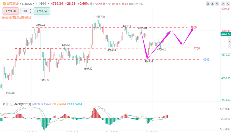 周一开盘大幅下跌,本已奠定弱势基础,但全天并未延续弱势,反而在低位持续反弹,且反弹成为周一市场的主要走势。从价格表现来看,始终在4700关口上方震荡,未有效跌破,可见黄金仍具备较强韧性,并非处于弱势格局。技术面来看,黄金日线级别图,昨日低开高走收阳,金价成功站上5日均线4745与10日均线4715美元,短期依托均线支撑呈偏强走势,MACD红柱小幅收缩,KDJ指标运行于50-60区间,反弹动能放缓但未转弱,中期多头趋势未逆转。4小时级别看,价格沿布林带中轨运行,均线呈多头排列,短期阻力聚焦4800美元(30日均线与前期高点双重压制),今日第一支撑4715-4700(10日均线与昨日美盘低点),更强支撑4644(也是昨日早盘低点)。综合来看,周一的大幅下跌并未带动黄金进入极弱状态,整体仍呈现震荡走势,收盘于4765附近。因此,在周二无突发消息的前提下,黄金大概率延续震荡格局,技术面暂无明显变化,H4周期布林带呈收口状态,大区间维持在4860-4650,小区间则在4800-4700。今日操作思路较为明确,短线以顺势支撑低多、阻力短空。