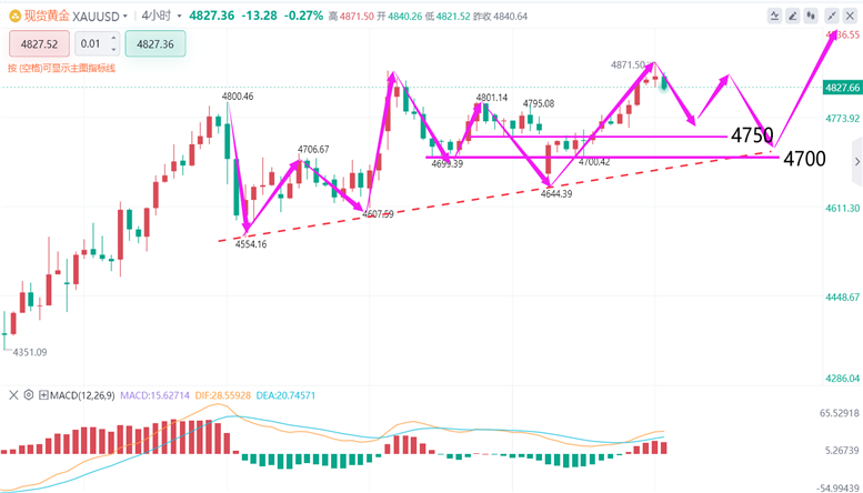 所以今天黄金的走势,没有确定性,虽然暂时强势,但也有可能回落。整体思路就是,在4800以上,继续看上涨,上方重点关注4860-4950这两个点位;如果回落跌破了4800,那黄金就会再次陷入震荡,下方也能看到4750、4700这两个低点。