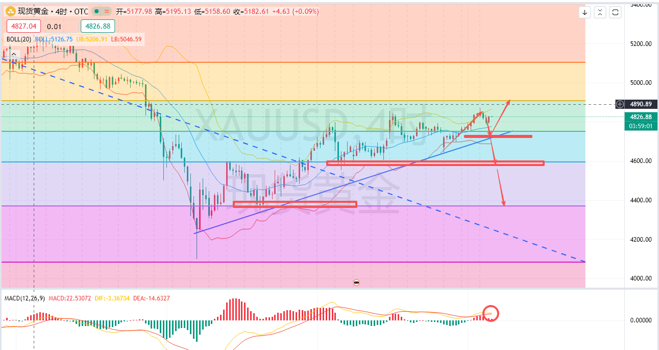 尽管市场情绪改善,但中东局势的根本性风险尚未解除。美国目前仍在推进对霍尔木兹海峡的海上封锁,以遏制伊朗原油出口,争夺这一战略水道控制权的博弈仍在持续,谨慎乐观跟风追涨,美盘依托4825-30空,40补仓空,上破4855损,谈判未落地之前,保持高空为主,高位追涨性价比不太高,目标的话看4750-4700,上方中线空机会再次留意4900关口,4小时MADCD很明显的在收口了,至少能看到4700一线。