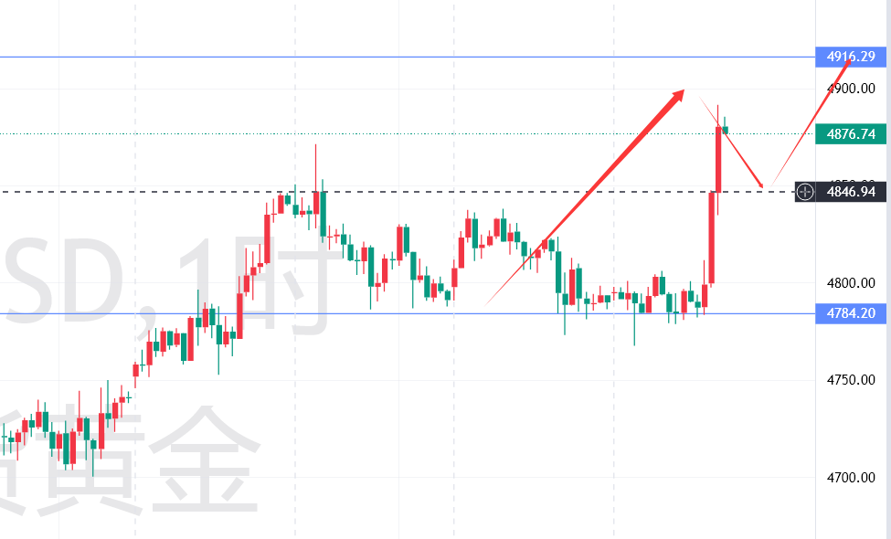 四小时级别来看,周期呈现明显的探底回升走势,价格下探4767低位后快速反弹,连续收出多根阳线突破前期震荡平台,打破了此前的区间整理格局。短期均线组多头排列,价格依托均线支撑稳步上行,回踩均线均能快速企稳反弹,短线多头趋势稳固。形态上形成圆弧底反转形态,底部支撑扎实,颈线位4840区域突破后形成强支撑。附图指标MACD金叉持续向上发散,双线距离拉大,多头动能充足;KDJ指标在高位运行但未出现死叉回落迹象,短线虽有震荡整固需求,但整体偏强运行,若能站稳4860上方,将进一步向4900关口发起冲击。