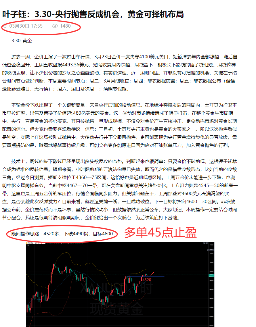 李馨玥: 3.30黄金盘中多单止盈4550,晚间依旧高空低多!
