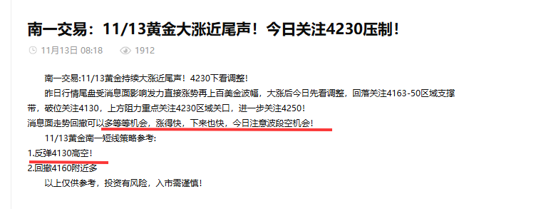 南一交易:11/14黄金隔夜4230波段空大胜!今日看修正!