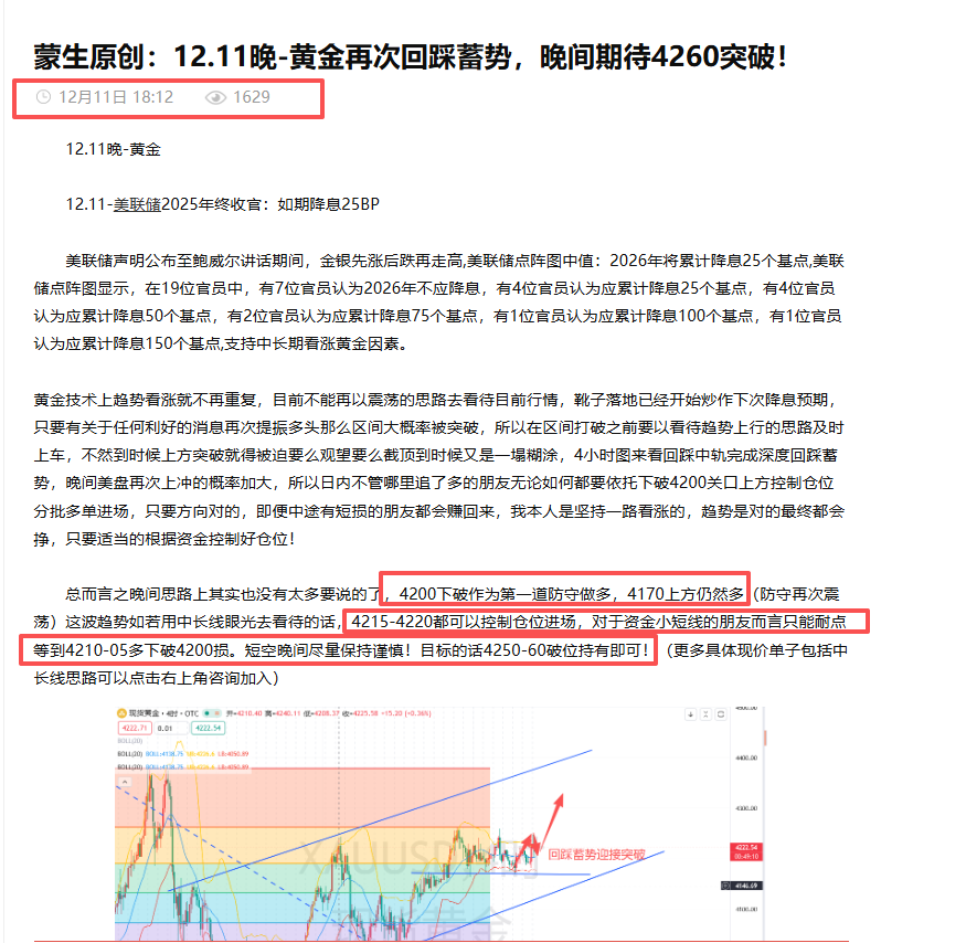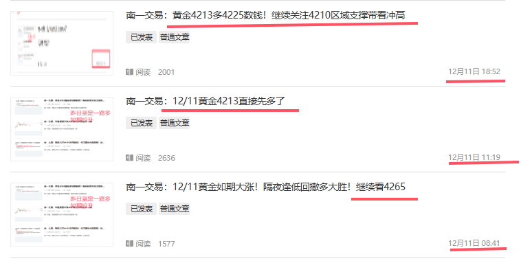 南一交易:12/12黄金冲高4265上完美兑现!4210区域一路多大胜!