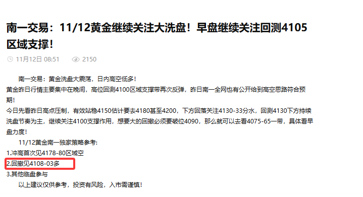 李馨玥:11.12黄金4100策略多隔夜大涨,日K中轨回踩再确认!