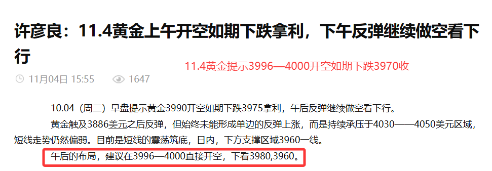 许彦良:11.04黄金日内两连开空如期下跌,晚间行情走势分析操作策略解析