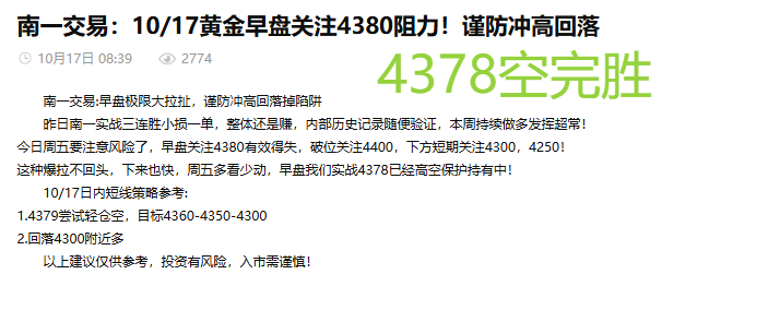 南一交易:10/174黄金4380下果然下来!4378空大胜!