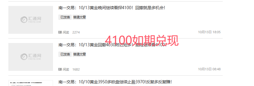 南一交易:10/13黄金4100果然兑现!尾盘关注4100阻力带!