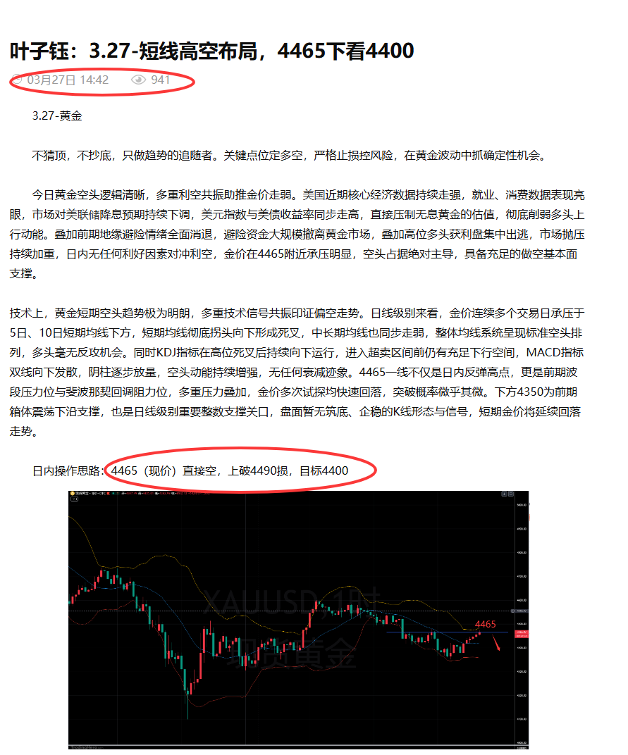 余梦圆:3.27-黄金4470空最低4410,反复继续空!
