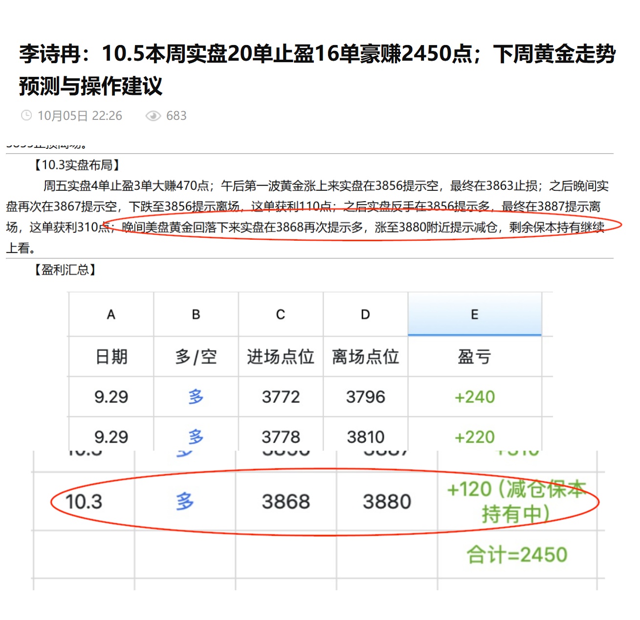 李诗冉:10.5本周实盘20单止盈16单豪赚2450点;下周黄金走势预测与操作建议