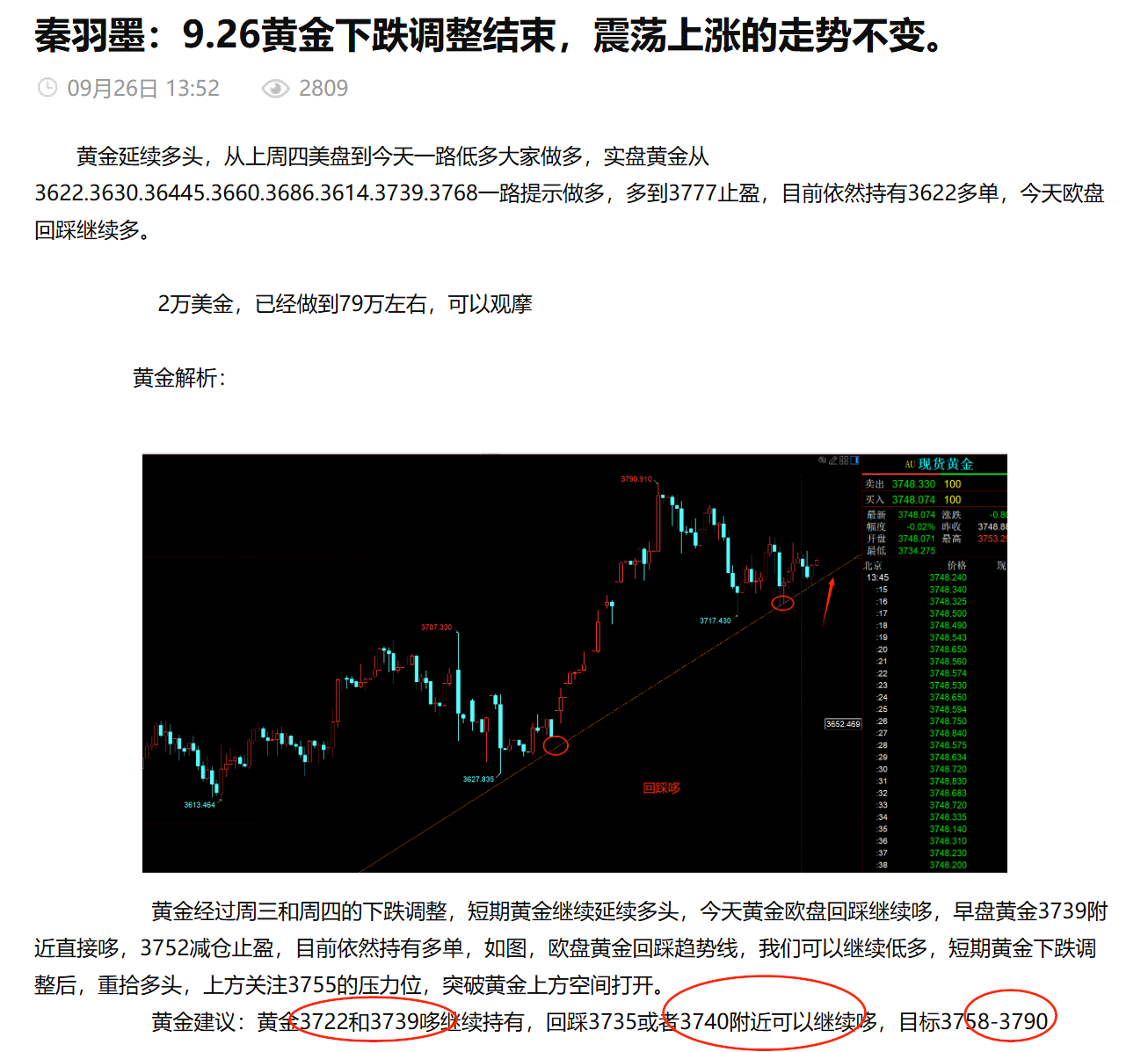 秦羽墨:9.26全网公开,黄金3740附近哆暴涨,美盘回踩继续哆