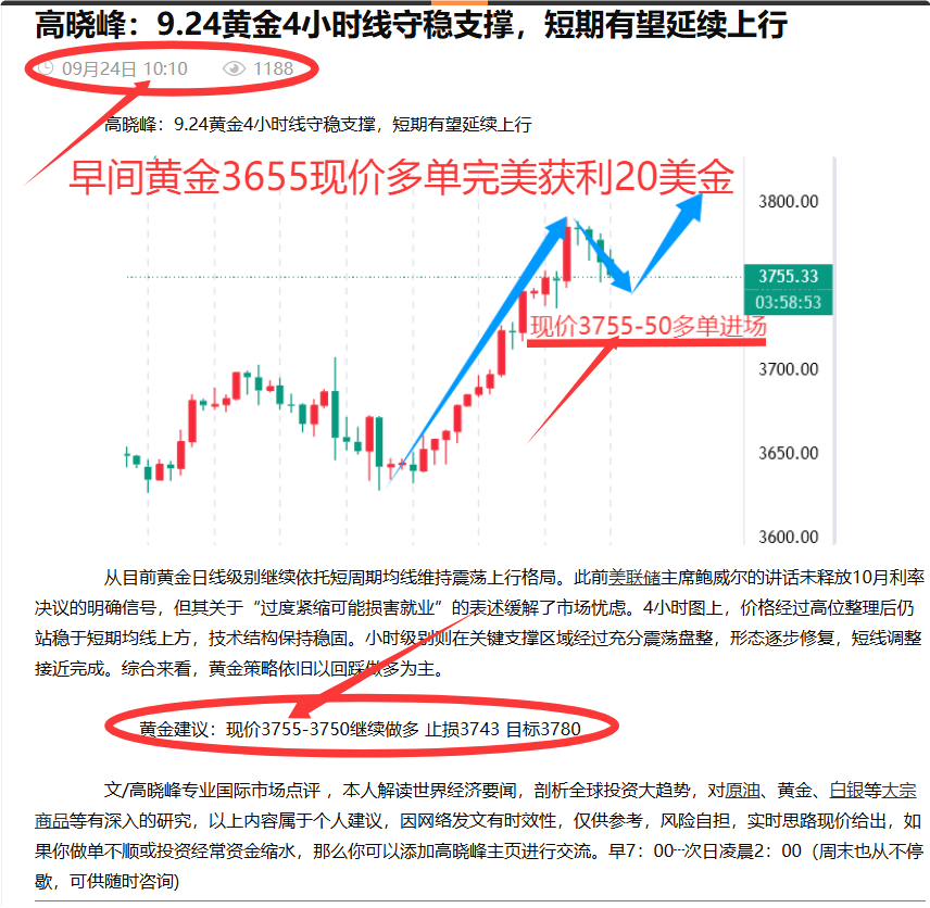 李槿:9/24黄金高位必回调!3775附近空大幅收割落袋!