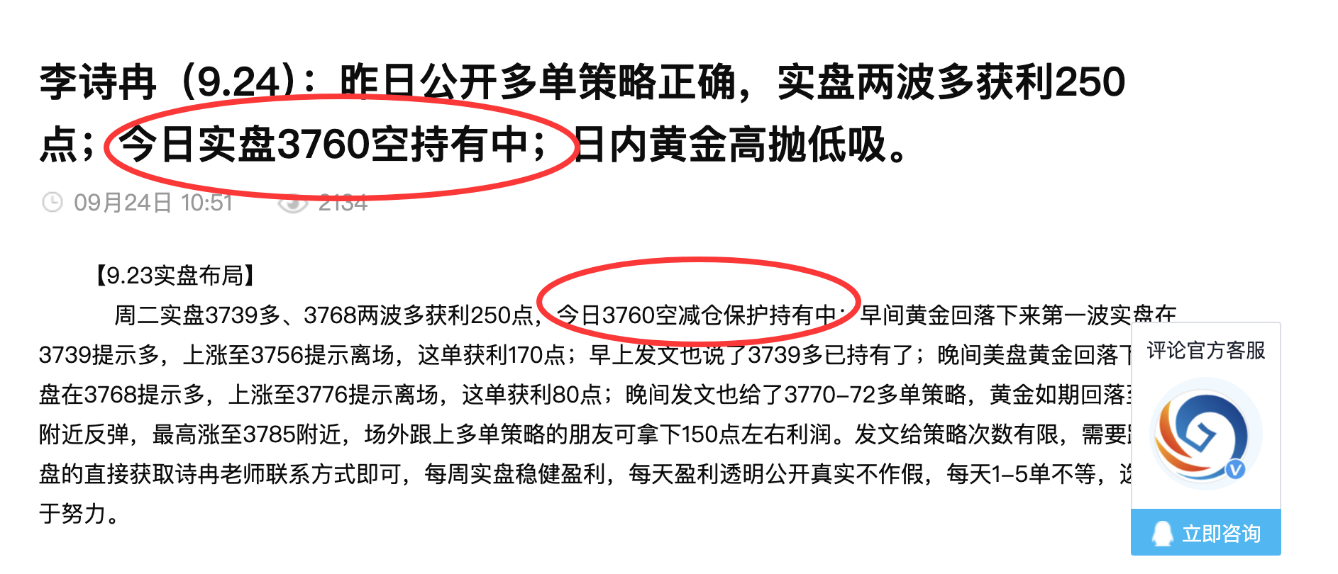 李诗冉(9.24):今日实盘3760空获利100点;晚间黄金低多。