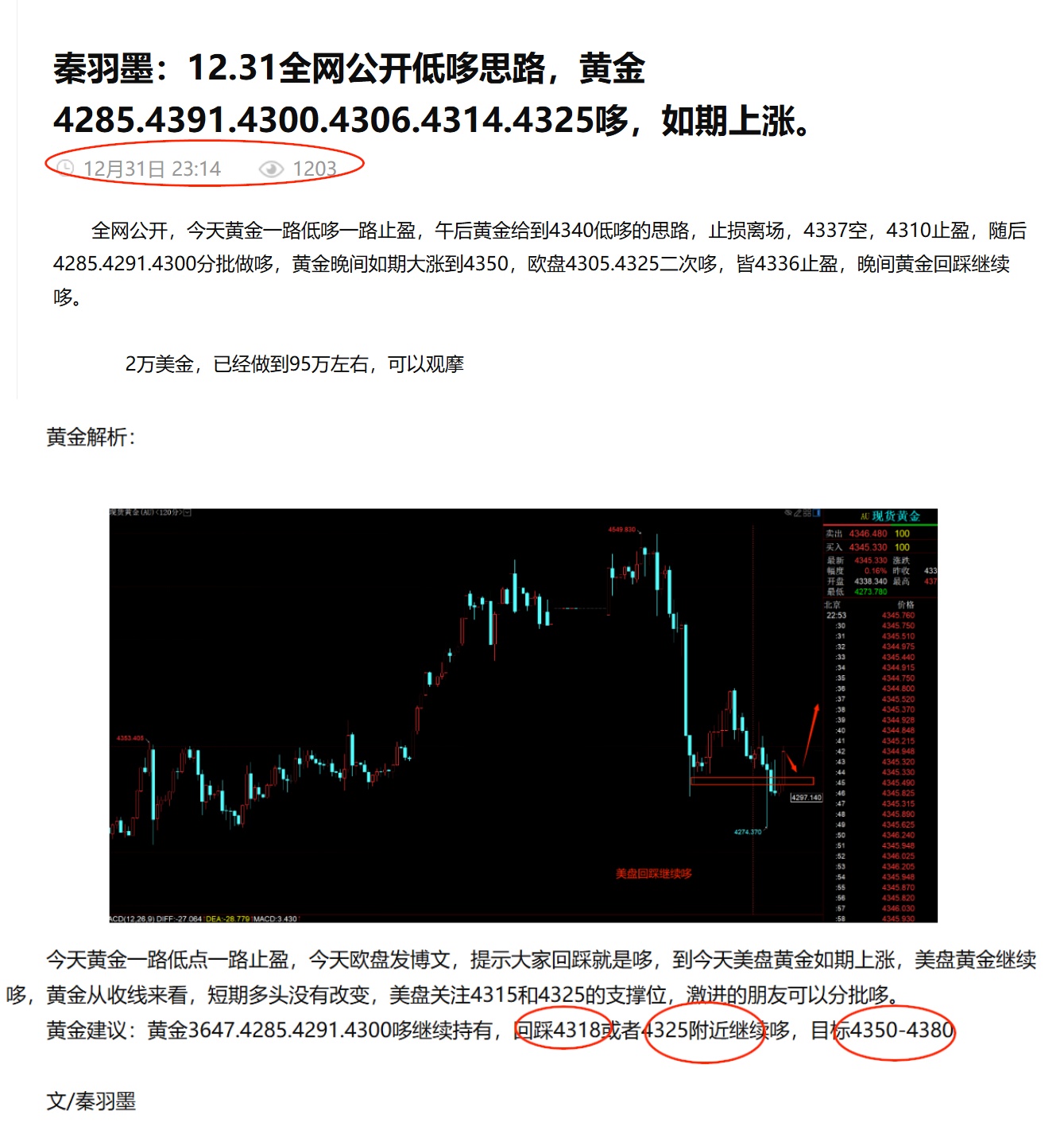 秦羽墨:1.2全网公开低点思路,4285.4291.4300哆,获利2330点,回踩继续哆一下