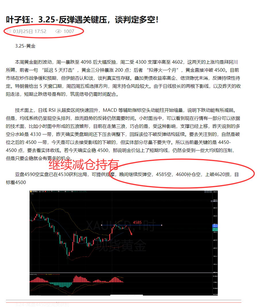 叶子钰:3.25-4595,4585空单双双获利,继续减仓持有