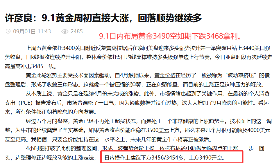 许彦良:9.2黄金短多拿下利润,现在回撤继续做多看涨延续