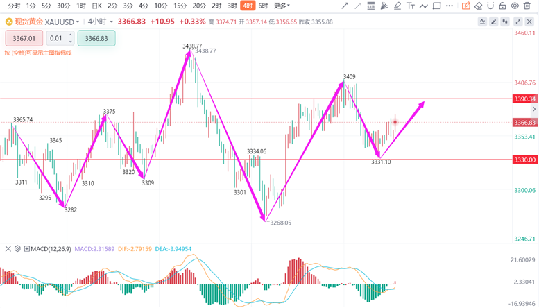 云杰:黄金震荡3364-3355连空3345减持,等待周五破位