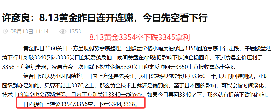 许彦良:8.14黄金早盘短多拿利,下午顺势做空看下行