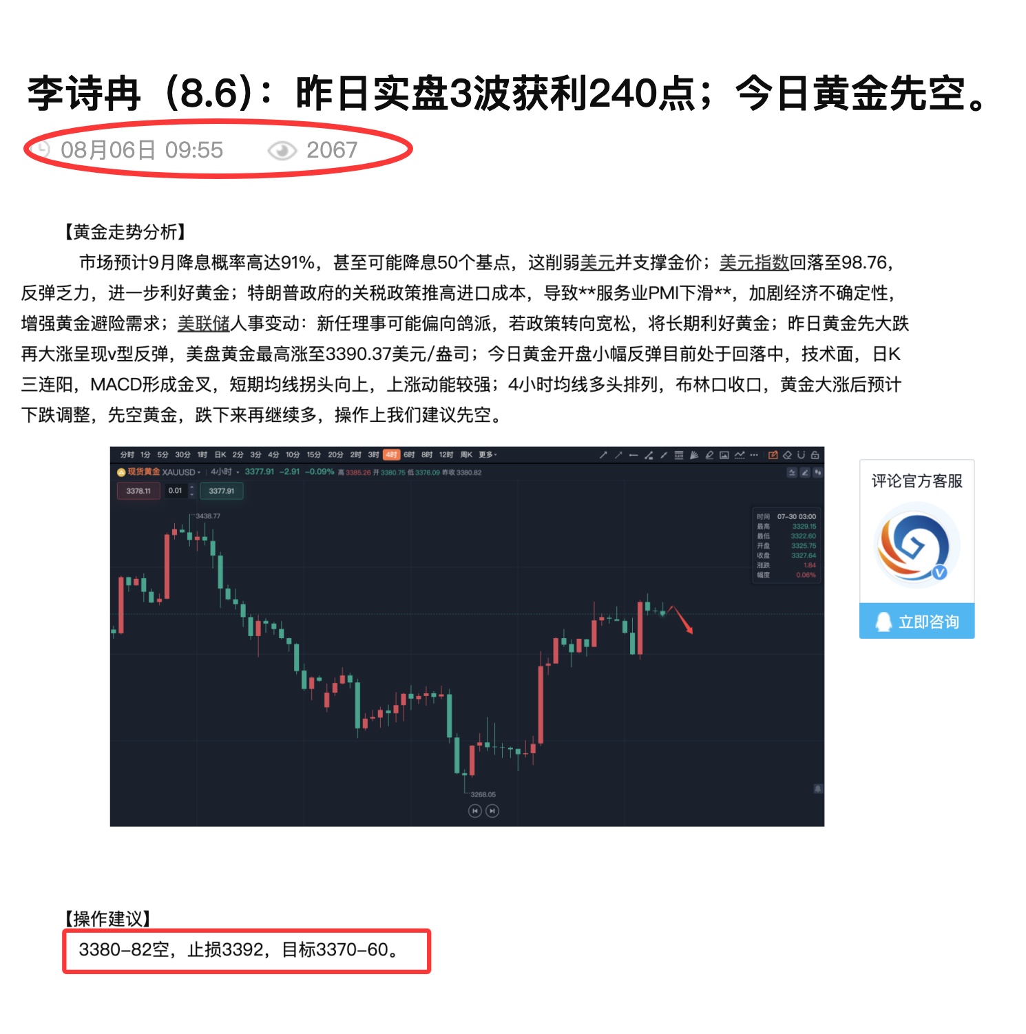 李诗冉(8.6):今日公开空单思路正确,实盘两波空获利130点;晚间黄金震荡对待。