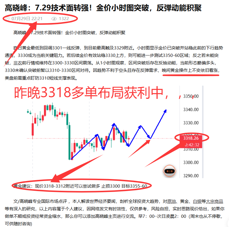 高晓峰:7.30黄金昨晚3318多单布局持续获利中,,,