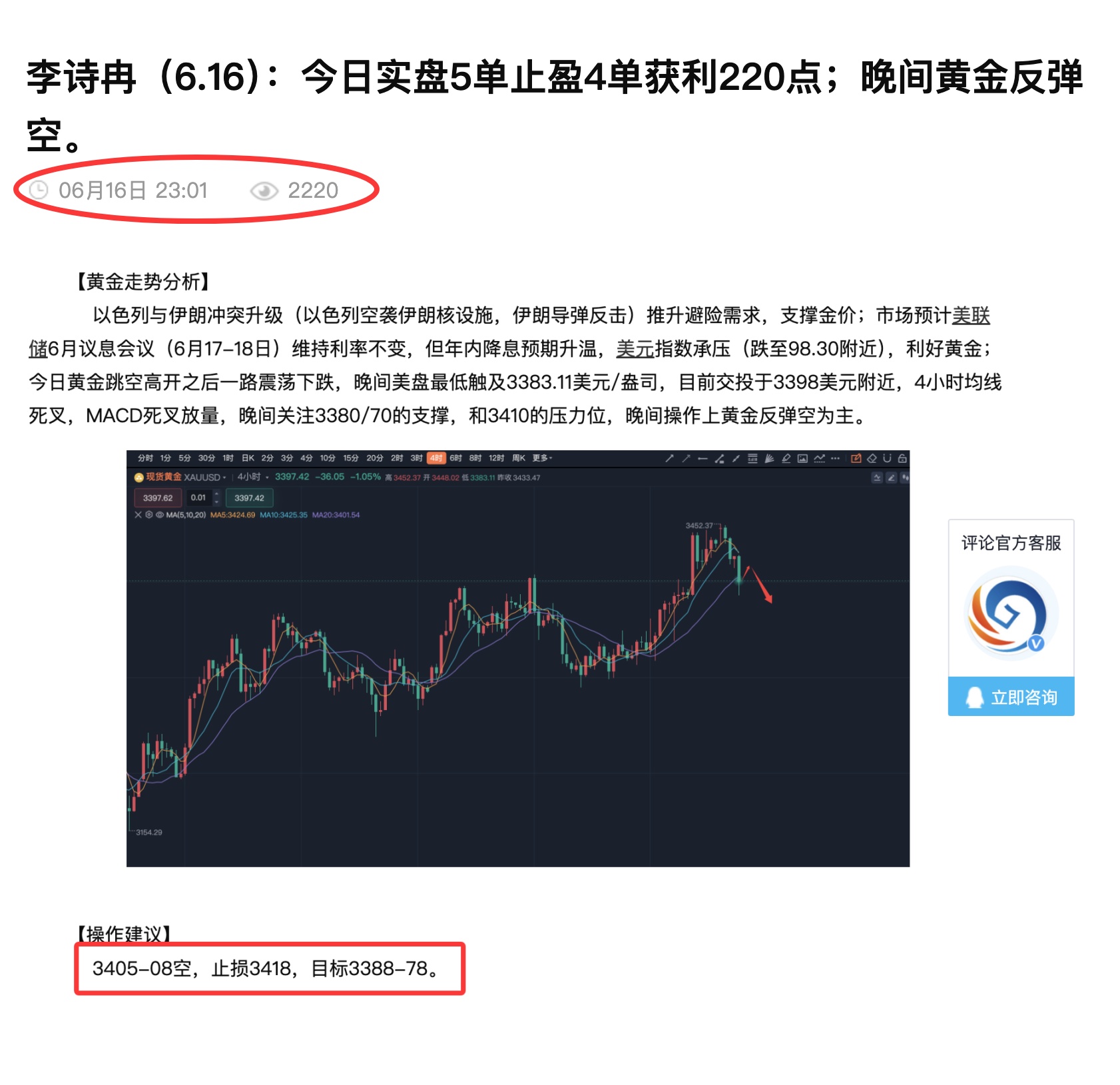 李诗冉(6.17):昨日晚间公开3405空单策略,点位精准,黄金如期大跌,实盘2多3空获利220点;今日黄金高抛低吸。