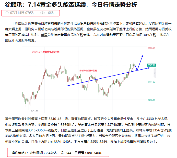 田浩洋:7.14黄金多头持续发力,突破新高近在咫尺