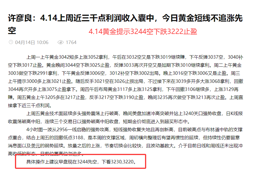 许彦良:4.14黄金日内五单全胜利润不断,晚间行情走势分析操作策略解析