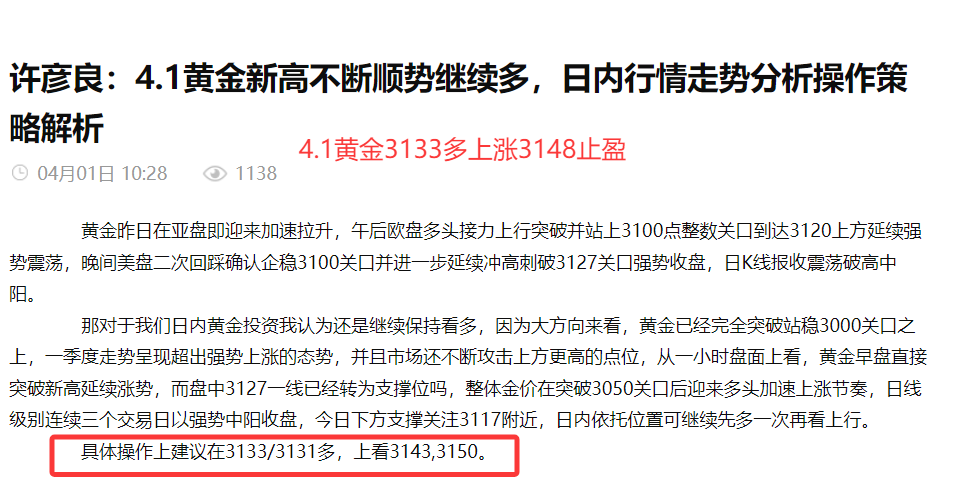 许彦良:4.2黄金昨日多空利润全拿,今日行情走势分析操作策略解析